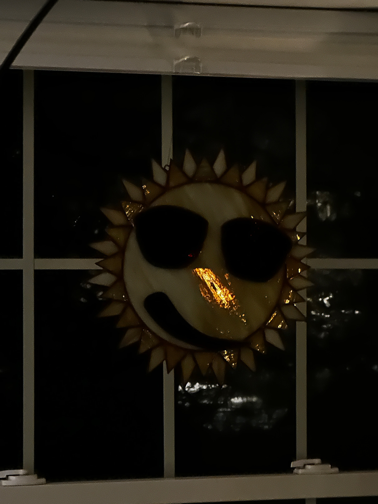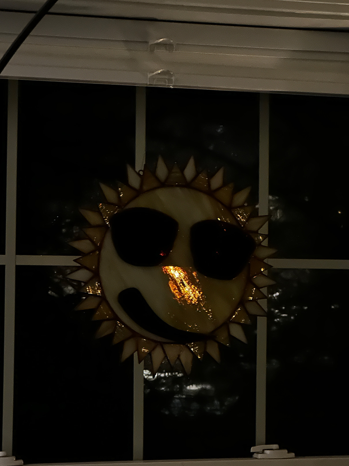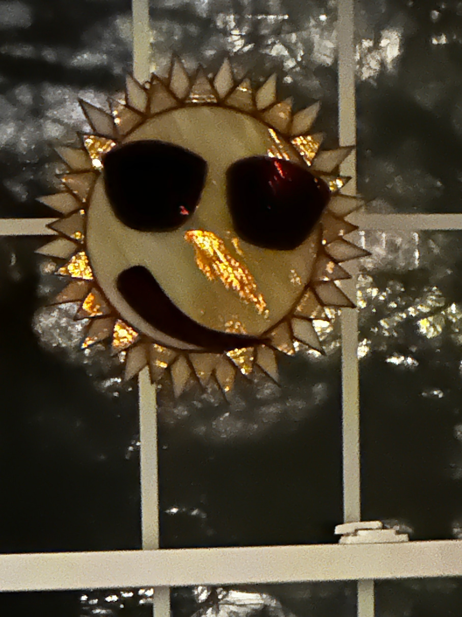 Description: Smirky Sun Suncatcher with a copper patina