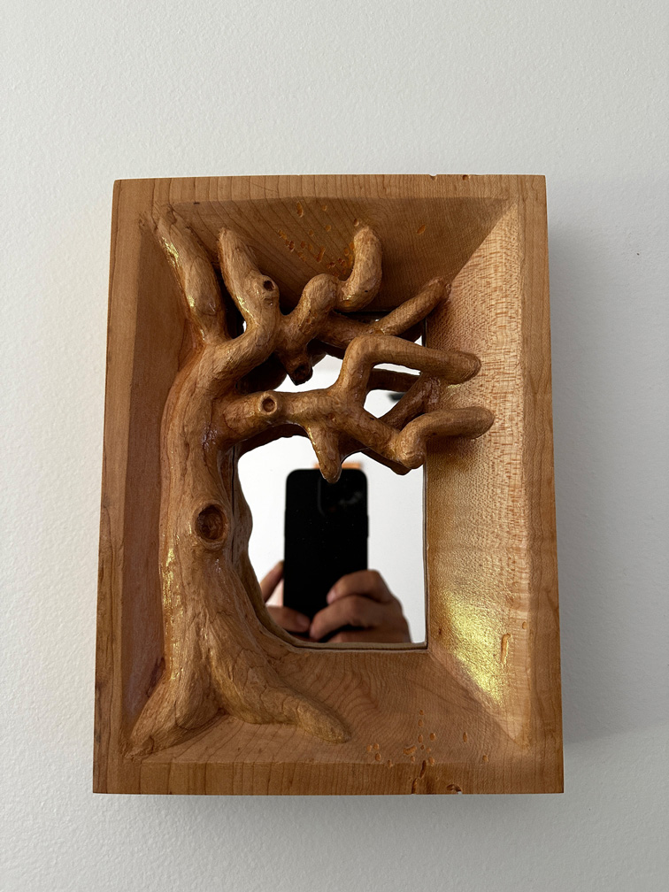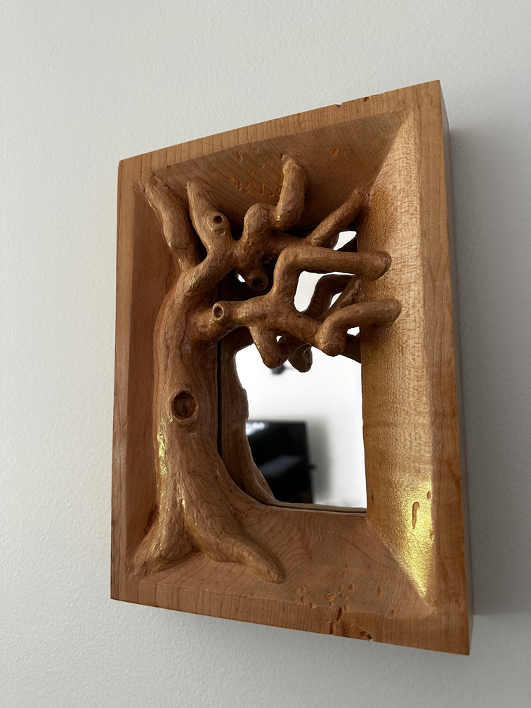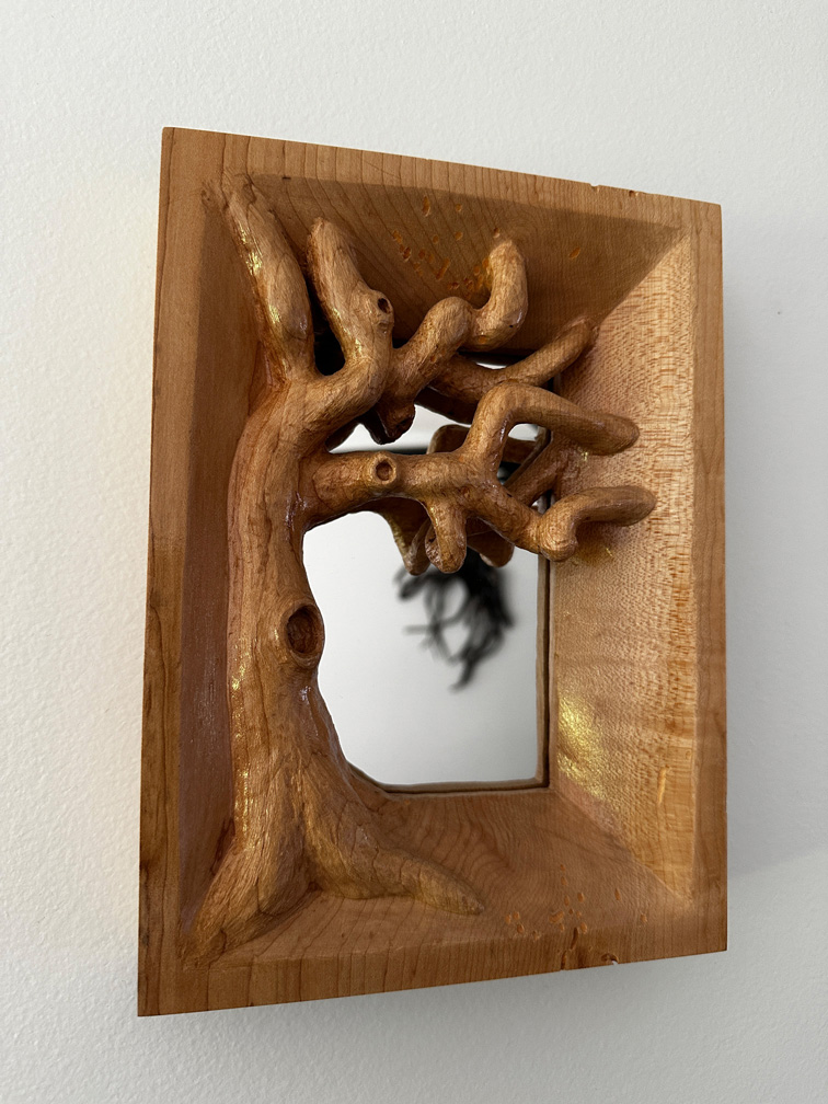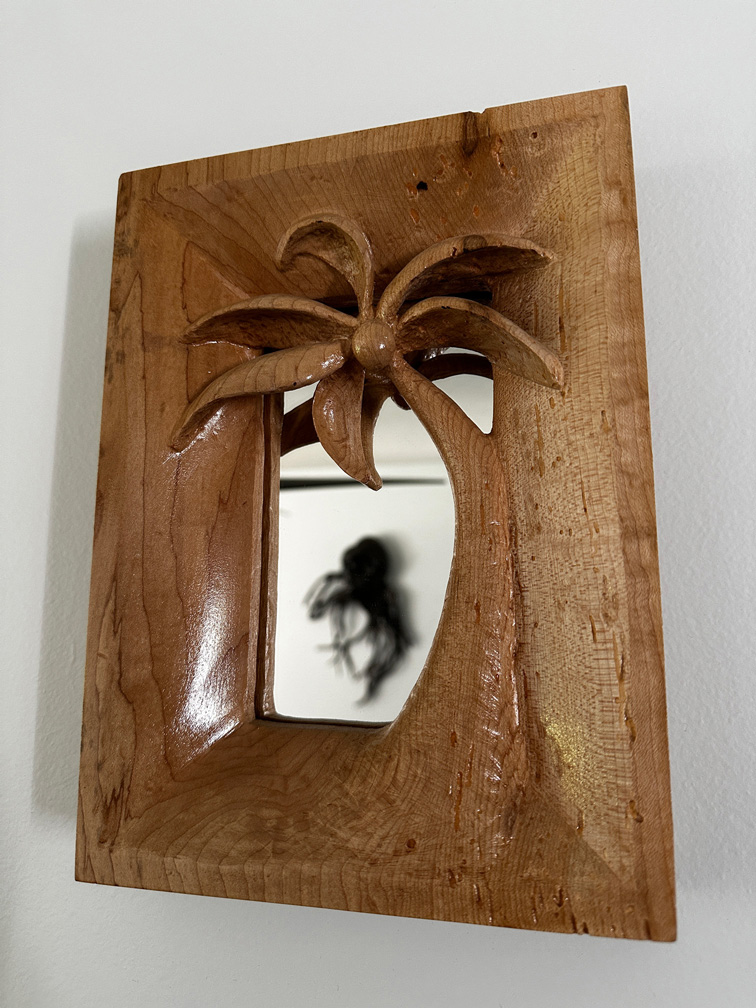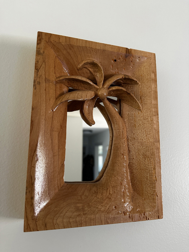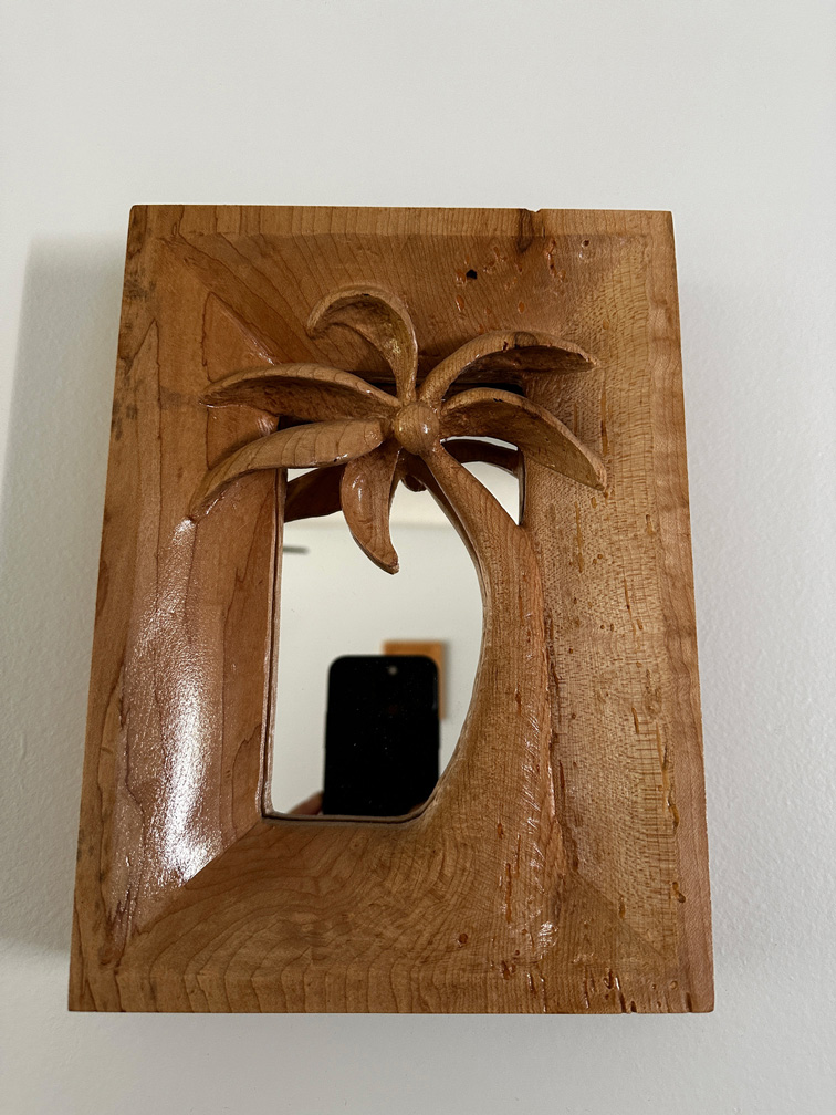 Description: Power carved this tree and a palm tree set from a piece of a huge Maple tree a neighbor had taken down on their property, and set a mirror behind it. Designed as kind of a Beach or Mountain question, in wood. You can clearly see signs of the boring insects that damaged the tree and caused it's removal.